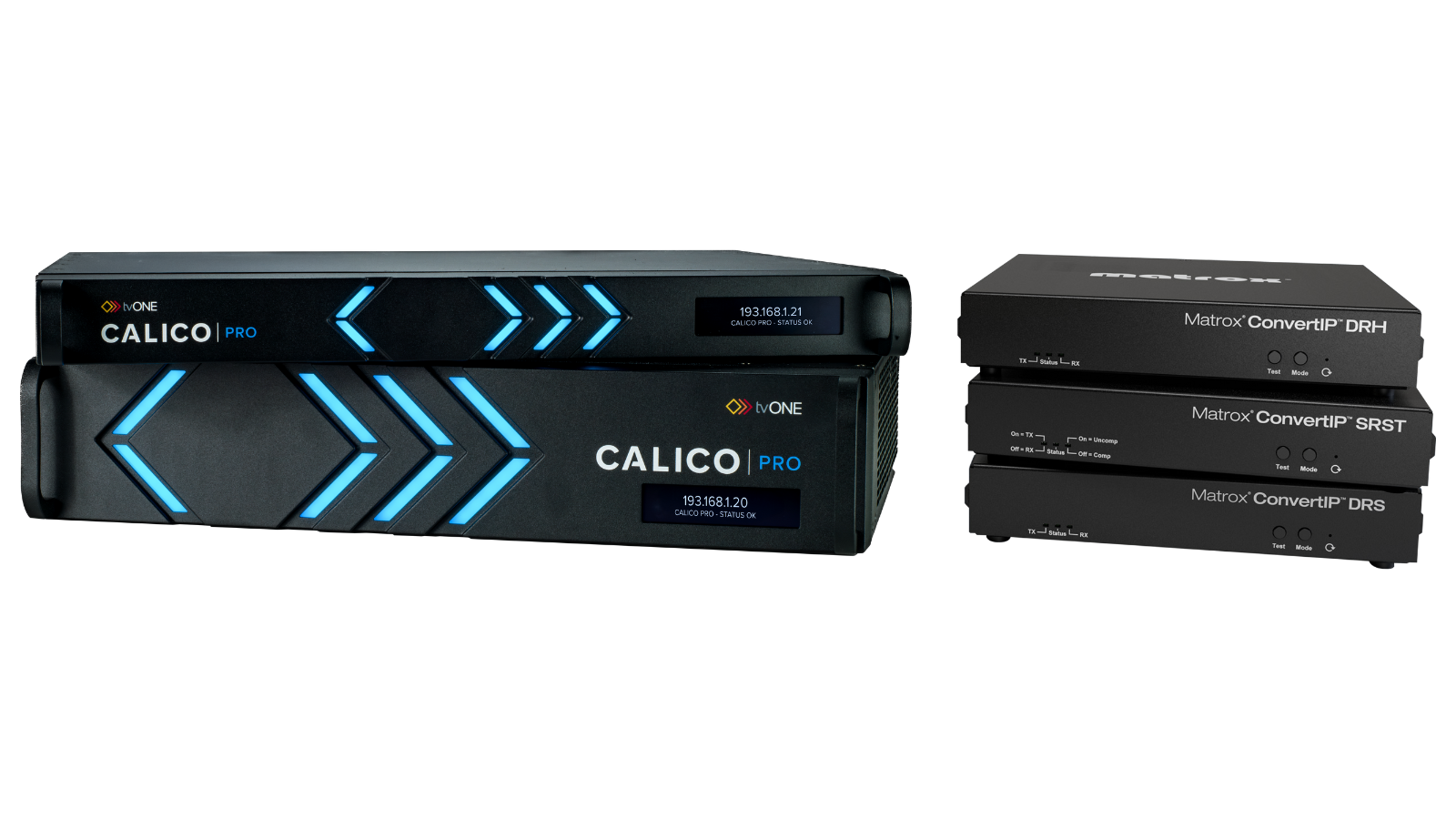 Cincinnati, OH - tvONE is proud to announce a strategic partnership with Matrox Video, combining CALICO PRO’s high-performance video processing with the Matrox ConvertIP Series of encoders/decoders and converters. This integration enables connectivity to SMPTE ST 2110 and IPMX infrastructures, supporting compressed and uncompressed workflows with pixel-perfect results across a range of environments including broadcast, live events, control rooms, and experiential.